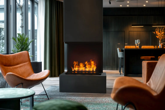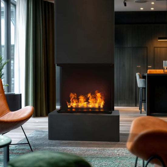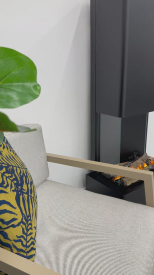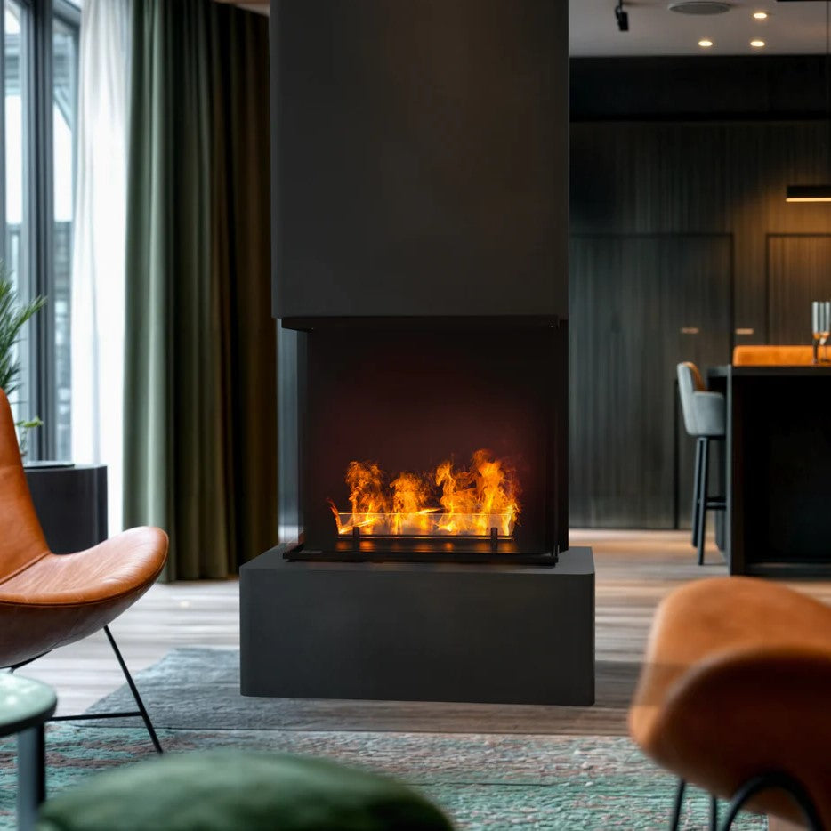 Aura er en høy og elegant vanndamppeis utviklet for innemiljøer der man ønsker et realistisk flammebilde uten varme, sot eller røyk. Den bruker ultrafint vann som belyses med LED-lys for å skape en levende og tredimensjonal flammeeffekt. Resultatet er en trygg og stemningsfull løsning som kan plasseres i rom der tradisjonelle peiser ikke egner seg. Aura leveres som en komplett enhet med kubbesett og fjernkontroll, og kan kombineres med aromaterapi for ekstra atmosfære. Den fungerer både som selvstendig møbel og som et visuelt blikkfang i større rom.