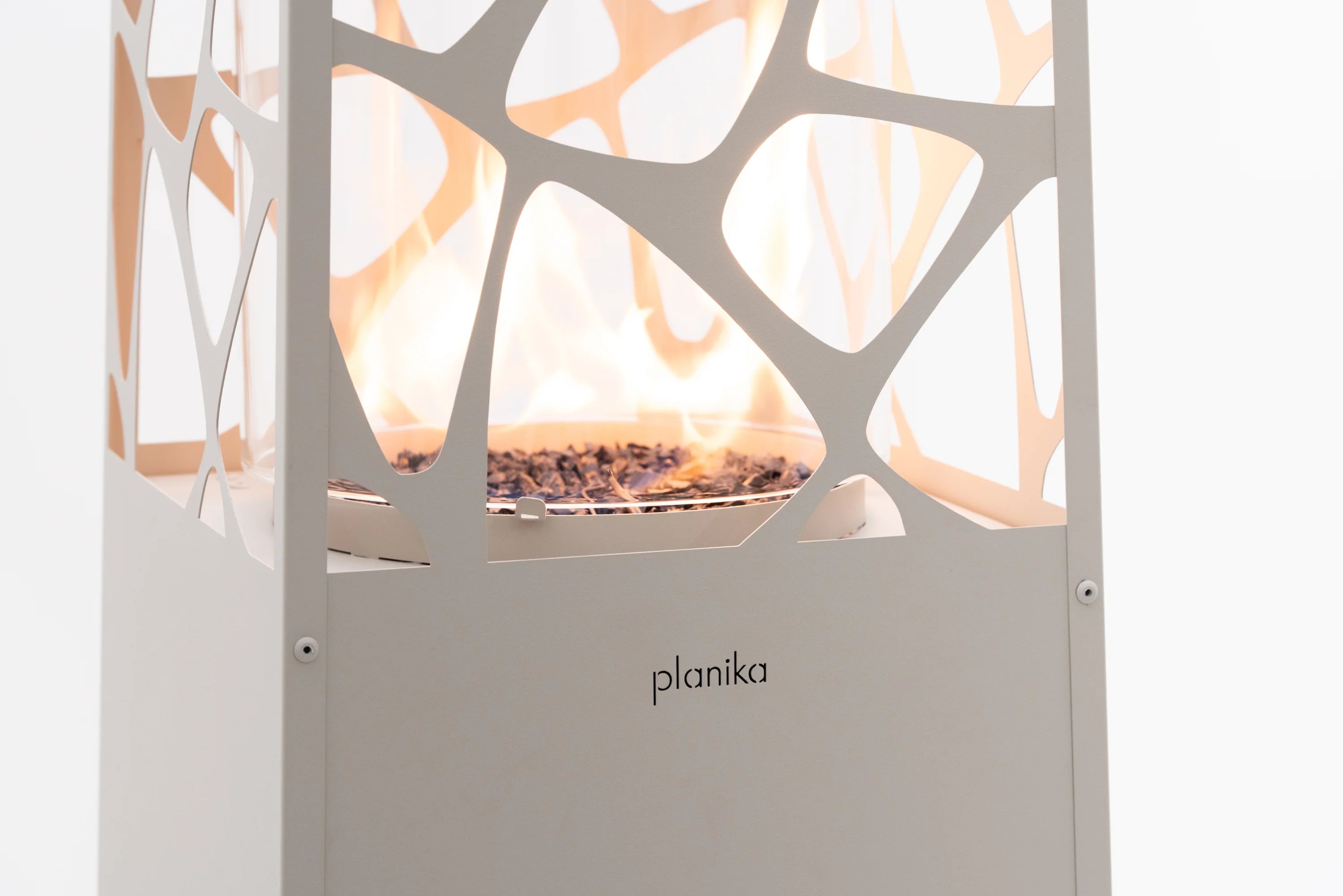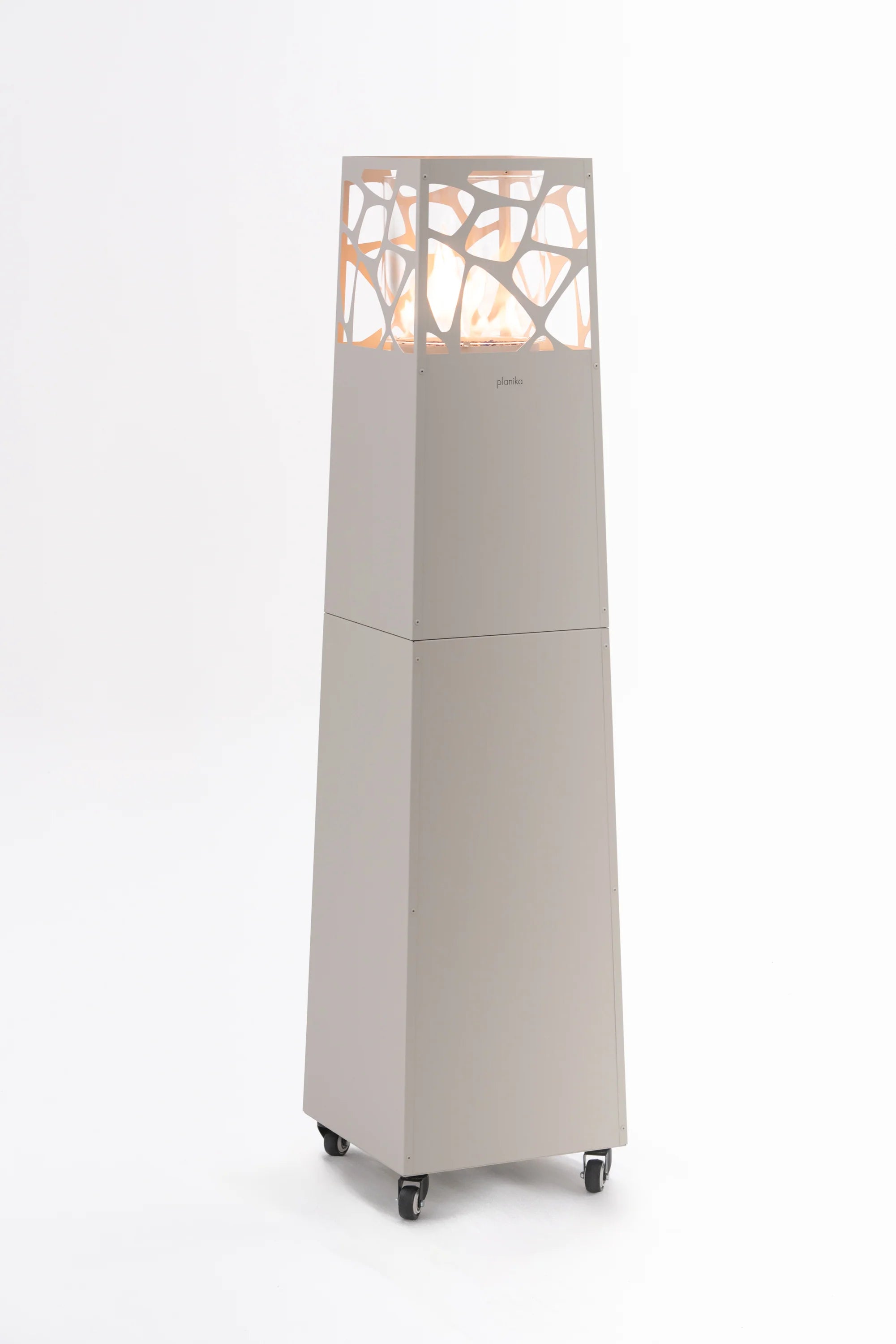 Planika Pyramid er en moderne terrassevarmer drevet av LPG-propan. Den skaper en kraftig og synlig flamme i en høy glasskonstruksjon, noe som gjør den til et dekorativt og funksjonelt element i uteområder som terrasser, inngangspartier og uteserveringer.